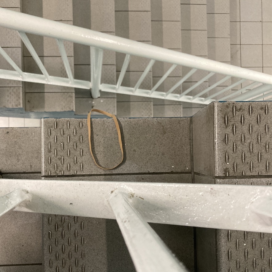 #ElasticBandPhotos ‘Welwyn Garden City 1’: A discarded elastic band in a stairwell in the shopping centre at Welwyn Garden City.