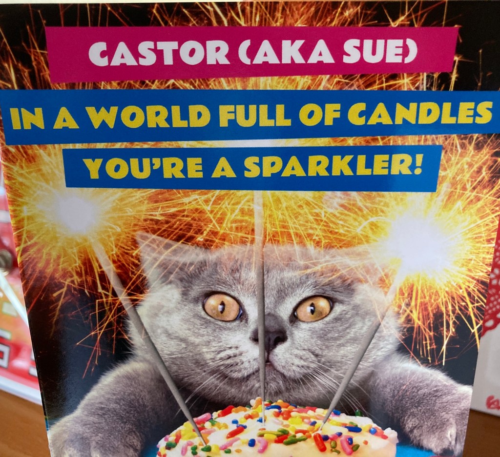 Alt text says it’s ‘A cat on a cake’. I say it is an excellent card to have received in the post to celebrate my birthday and shows a cat presenting an iced birthday cake with sparklers with text reading ‘Castor (AKA Sue) In a world full of candles you’re a sparkler’. I love cards and I love the fact that I wear a number of names. Sometimes I am Poodle Floppet, sometimes I am Sissy, sometimes I am Sooper Sue, sometimes I am Freda, sometimes I am Castor to someone else’s Pollox.