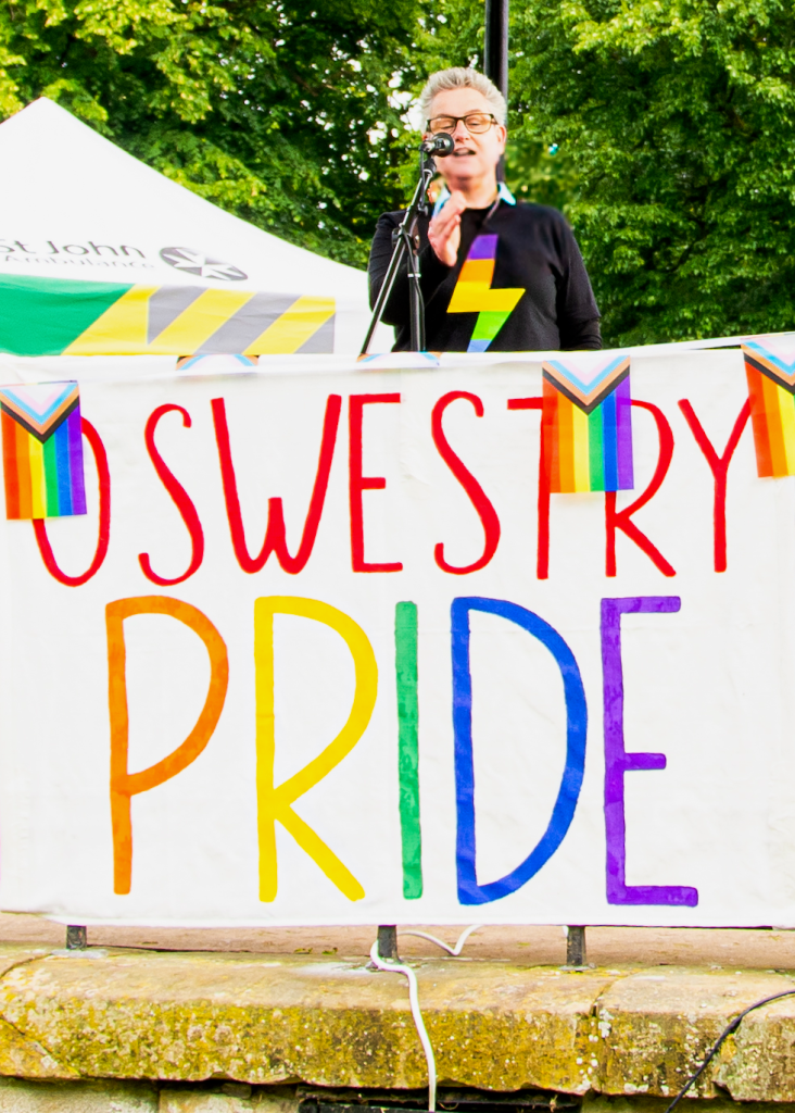 Alt text says this week’s photo is, ‘A person standing behind a sign’. I say it is a poet slightly on tiptoe because they didn’t really adjust the mic properly for themselves reading the first poem in their set at Oswestry Pride 2024. I also say they must have disappeared behind the sign each time they bent down to select a different book to read from and missed the opportunity to milk that moment by popping up like a puppet!