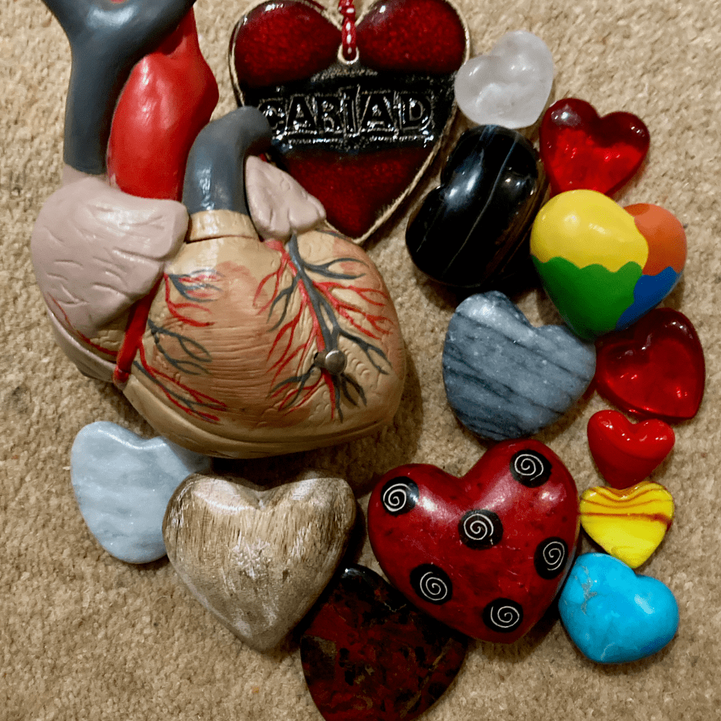 Alt text says this week’s photo is a group of heart shaped objects. I say it is the contents of my heart jar, and that some of these hearts are just right for fitting in a pocket and some definitely aren’t. I also say there is a rose quartz heart missing from this collection, but even though it is not here it has been remembered in a poem.