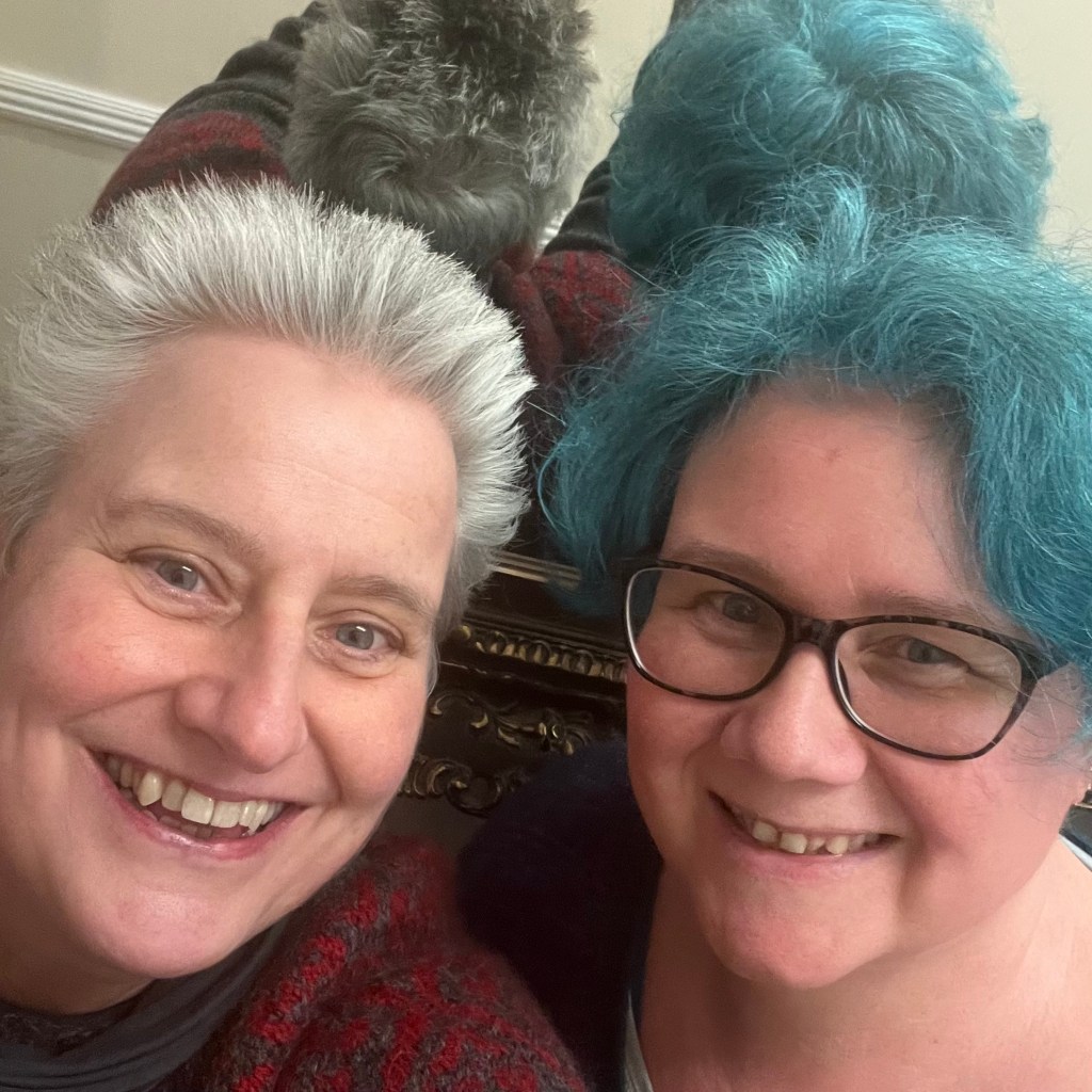 Alt text says this week’s photo is two women smiling for a selfie and indeed it is. It is Kath and I in a corridor in a hotel in Blackpool the night before a yarn show.