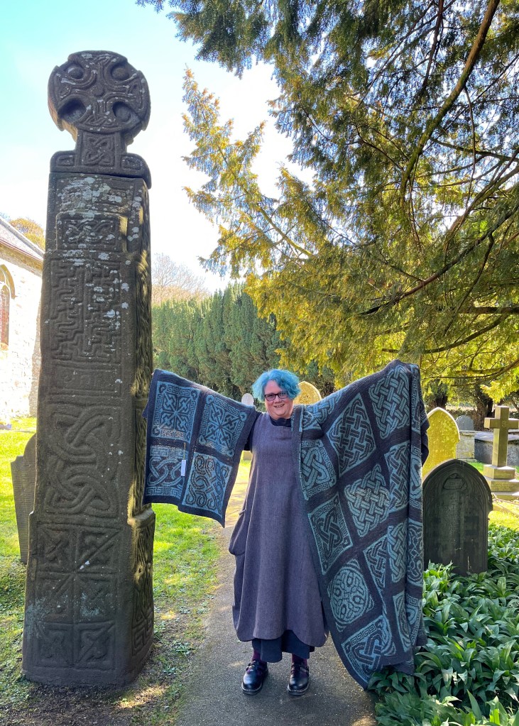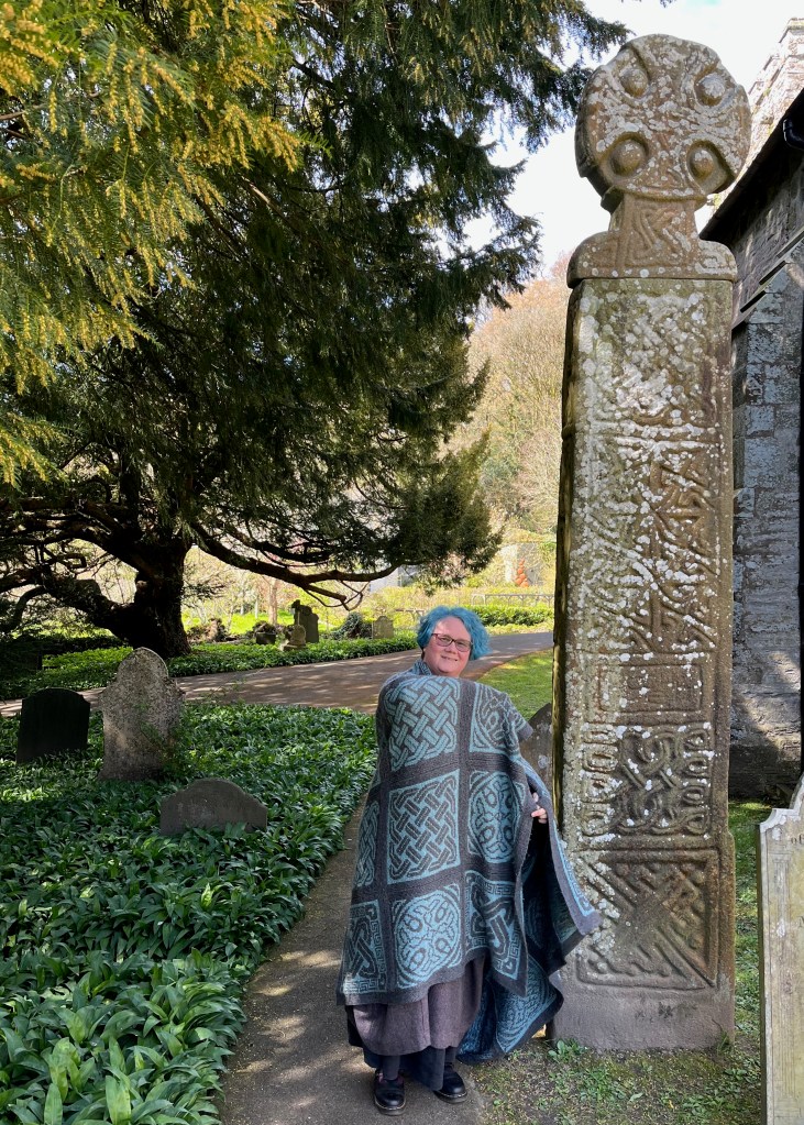 Alt text says this week’s photo is a person standing in front of a stone pillar. I say it is Kath wrapped in her Nevern Blanket at The Nevern Cross in Pembrokeshire.