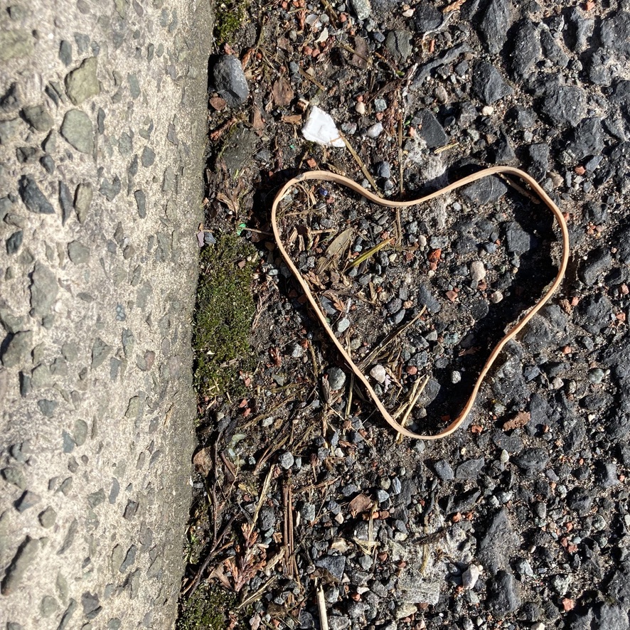 Alt text says this week’s photo is a heart shaped object on the ground. I say it is ‘Lovely’, a photograph I took of a discarded elastic band found in the gutter near the end of my road in February 2022.